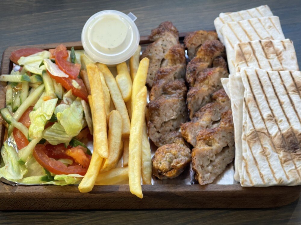 Ланч «Люля кебаб со свининой» — сытный и вкусный ланч, который поднимет настроение в течение дня! Сочный люля кебаб из свинины, приготовленный на гриле, дополнен хрустящим картофелем фри, свежим салатом из айсберга, томатов и огурцов, ароматным лавашом на гриле, а шашлычный соус, лук и зелень придают блюду особую пикантность.