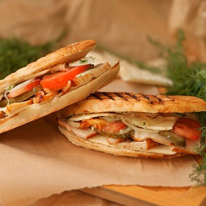 Лепешка, шашлык из куриной филе, маринованные огурцы, сыр плав., лук, зелень, помидоры